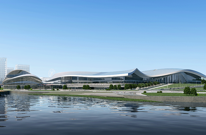 烟台八角湾国际会展中心位于烟台开发区八角街道,占地13.9万平方米,建筑面积24.6万平方米, 总投资约33亿元,由美国著名设计公司 AECOM根据第五代会展综合体定位设计,以“城岸云浪·海上云贝”为设计理念,将烟台的碧海与蓝天相接,海浪与白云相交融,再融入轻盈的银贝最终演化出建筑结构与造型相互统一、结构清晰的,集展览区、会议区和配套商业区为一 体的会展商业体